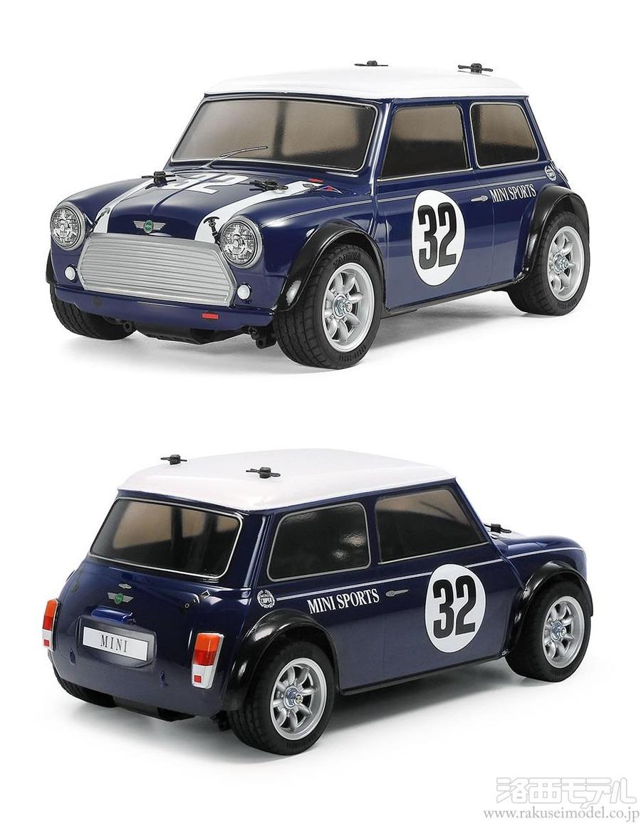1959年から2000年までモデルチェンジすることなく約530万台が生産され、20世紀を代表する車「カーオブザセンチュリー」の2位に選出された初代ミニ。当時としては珍しい前輪駆動を採用し、メカニズムを小さく、室内を最大限に確保した優れた車体構成と軽快な走行性を実現した革新的な車でした。61年にはスポーツタイプのミニクーパーがラインナップ。レースやラリーで大活躍を見せ、本国イギリスはもちろん、日本をはじめ世界中で人気を集めました。そんな走りのムードたっぷりのミニクーパーを再現した電動RCカーの組み立てキットです。ポリカーボネート製ボディはボディ本体をブルー、ルーフをホワイトで塗装済み。ホイールアーチのカットやボディキャッチの穴開け加工も施しました。また、ボンネットのストライプやボディサイドのピンストライプ、ゼッケンなどはステッカーで用意。クラシカルなデザインの8本スポークホイールに60Dラジアルタイヤを装着して、RCサーキットでの走りが楽しい1台です。