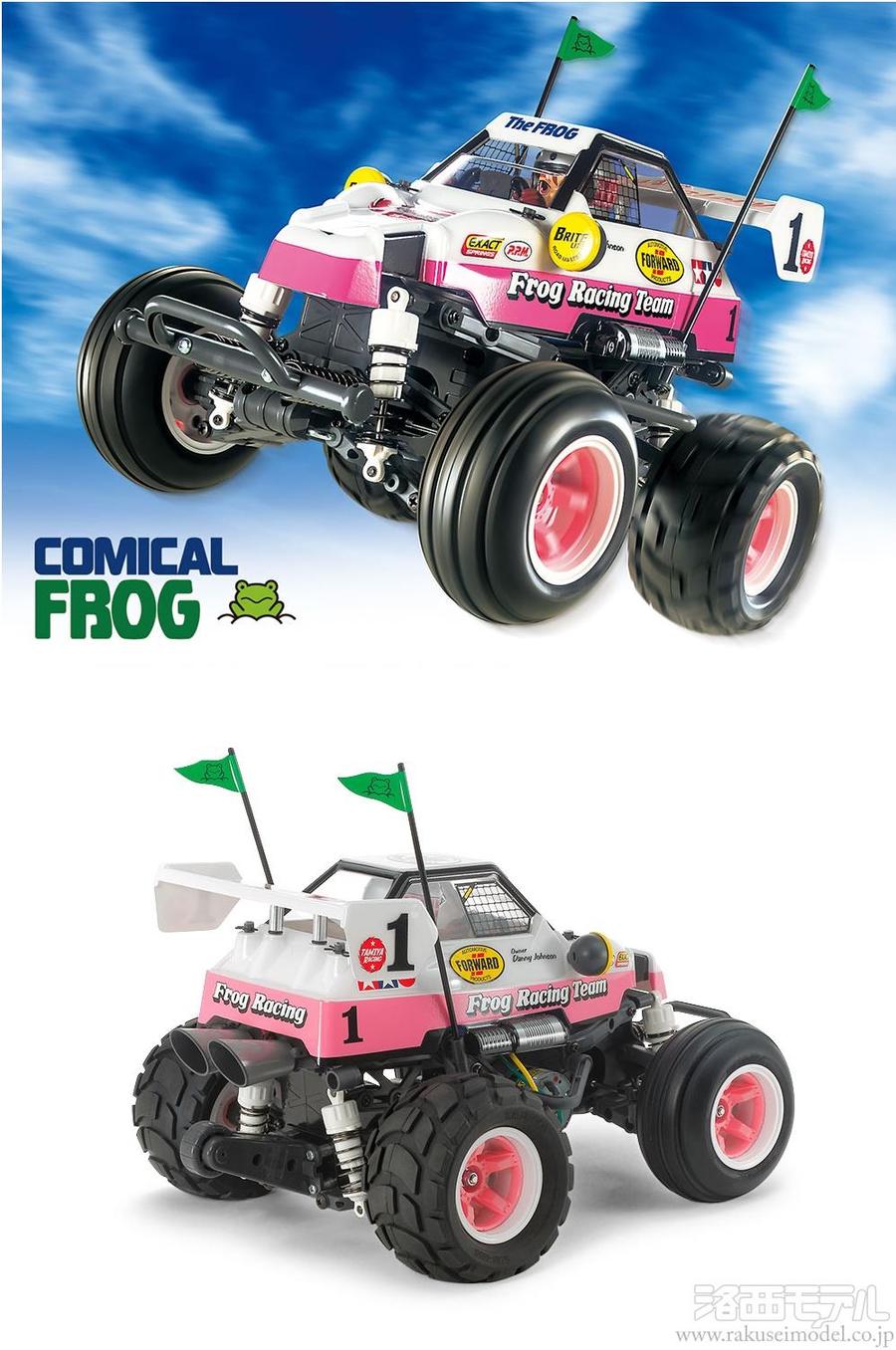かわいらしいカエルのトレードマークとフロッグという名前とは裏腹に、独創的な車体構成と高性能な走りで人気を集めた2WDバギー、マイティフロッグ。実車のシングルシーターレーシングバギーをイメージした、オリジナルデザインのマイティフロッグのボディをコミカルにデフォルメして、バブルタイヤを装備した後輪駆動シャーシに搭載した電動ラジオコントロールカーの組み立てキットです。ボディは透明ポリカーボネート製、ヘルメットをかぶったTシャツ姿のドライバー人形も付いています。シャーシはワイドなタイヤレイアウトと、走行用バッテリーを車体後部に縦置きしたWR-02CB。舗装された道から、凸凹のあるオフロードまでどこでも遊べ、送信機のスロットルレバーをぐっと握るだけで、前輪を持ち上げたウイリー走行も可能。さらに、豊富にそろったWR-02CB用のオプションパーツで性能アップやセッティングも楽しめる、面白さ満載の楽しい遊び友達です。