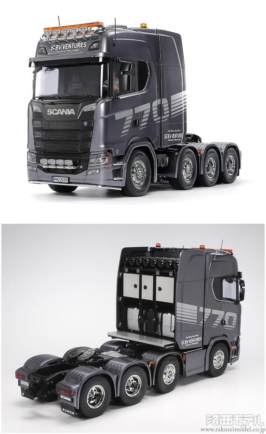 大型トラックメーカーとして知られるスウェーデンのスカニア社。同社が2016年に発表した新世代モデルの最上級グレードがSシリーズです。中でも、2020年に追加された、770馬力を誇るV8ターボディーゼルエンジンを搭載する、前2軸操舵・後2軸駆動の8輪重トレーラーヘッド、スカニア 770 S 8x4/4の電動RCカー組み立てキットです。精密金型を使用して、ハイルーフ仕様を実車そのままにモデル化。しかも、堂々としたボディはキャブ本体はもちろん、サイドディフレクターやルーフ、バンパーなどをガンメタリックで塗装し、ウレタン系トップコートを施しました。ドライバーを囲むようなラウンド形状のダッシュボードなどが備わるリアルな室内に加え、ヨーロッパで人気のカスタムパーツなども魅力。シャーシはアルミ製チャンネル材を使用したラダーフレーム。前2軸を1個のサーボで操舵し、モーターのパワーを3速ミッションを介してリヤ2軸に伝達します。さらに、第2軸には車軸を持ち上げる機能、「リフトアクスル」を搭載。手動操作でタイヤを上下させることができます。