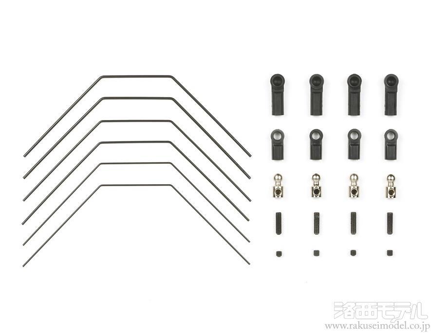 コーナーの切り返しやハイスピードコーナリング時の安定性を高めるスタビライザー。前後それぞれ3種類の硬さのスタビライザーバーをセットして、コースレイアウトや路面グリップに合わせたセッティングが可能です。