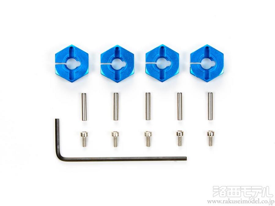 4mm厚アルミホイールハブ×4、キャップスクリュー×5、ステンレスシャフト×5などをセット