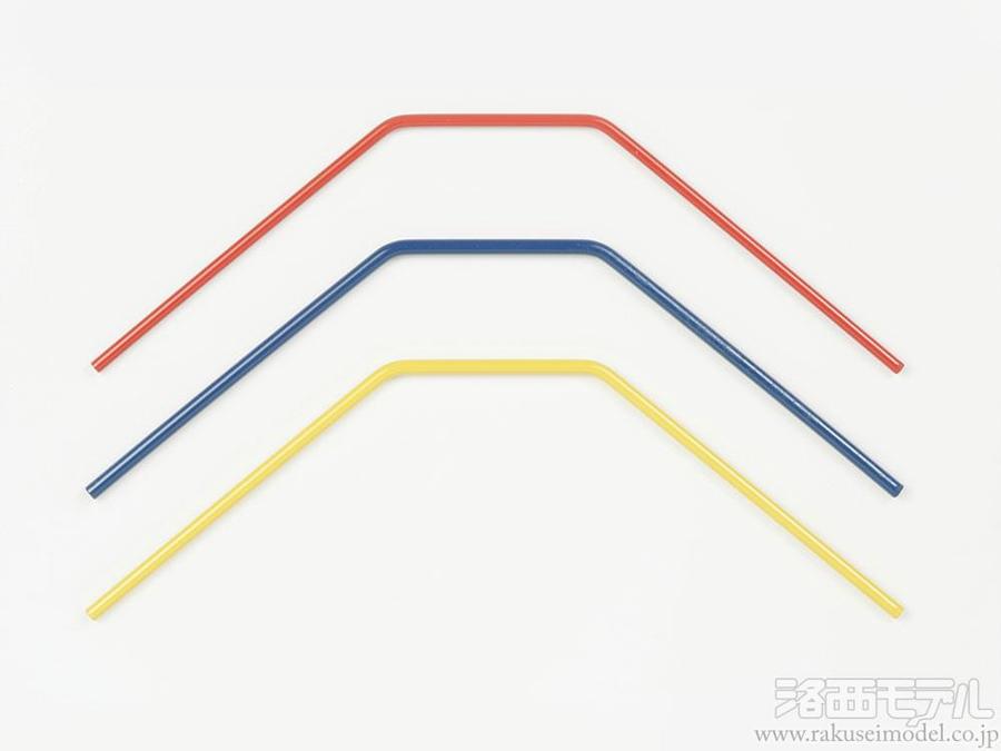TG10-Mk.2シャーシのリヤサスペンションのセッティングに欠かせません。ソフト(赤)、ミディアム(黄色)、ミディアムハード(青)の3種のスタビライザーロッドをセットしました。