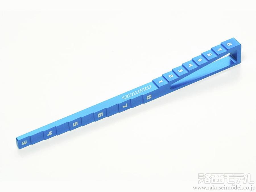 ツーリングカーのハイト(車高=最低地上高)と、ドゥループ(サスペンションが下がる量)が計測できるゲージです。特にドゥループ量は、現在のツーリングカーのセッティングで重要なポイントとなっている、サスペンションのリバウンド量の目安になります。ブルーアルマイト処理されたアルミの削り出し製。レーザー加工により数字やロゴを彫り込んだ高品質な仕上がりも魅力です。