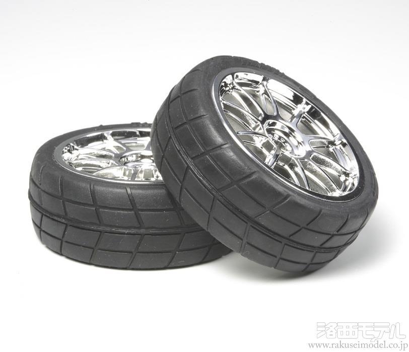 箱から出してすぐに車に装着できるタイヤ接着済みのホイールです。ツーリングカー各車に使用でき、メッキ仕上げの10本スポークデザインが足もとを引き締めます。ホイールは24mm幅、オフセット0。タイヤはミディアムナローレーシングラジアル。