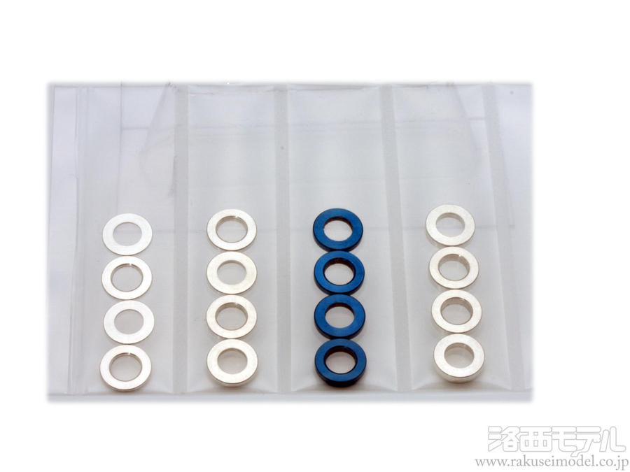 より正確にキャンバー角度の調節が可能になります。0.5mm/1.0mm/1.2mm/1.5mmの4種類を用意しました。ボディーに応じた車幅調整にも非常に便利なアイテムです。