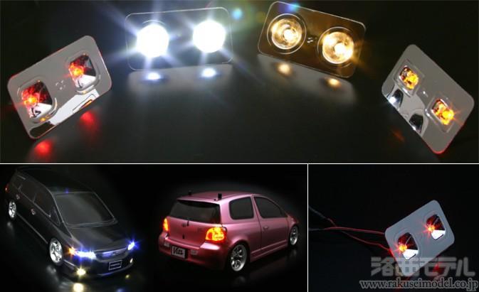 ホワイト、レッド、イエローの従来のカラーに電球色が加わり、60〜70年代のヴィンテージカーのヘッドライト、またラリーカーのハロゲンランプの表現等にリアリティを持たせます。 さらには光り輝くメッキライトカバーを標準装備!通常のメッキ風塗装では出せない本物の輝きもワンセットになりました!