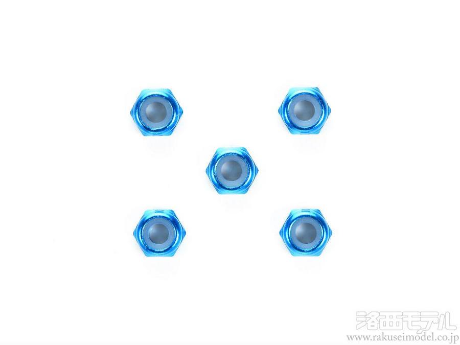 3mmロックナットを使用しているRCカー各車に使えます。薄型のアルミ製のため軽量化に効果的。またブルーアルマイトを施し、ドレスアップ効果も十分です。