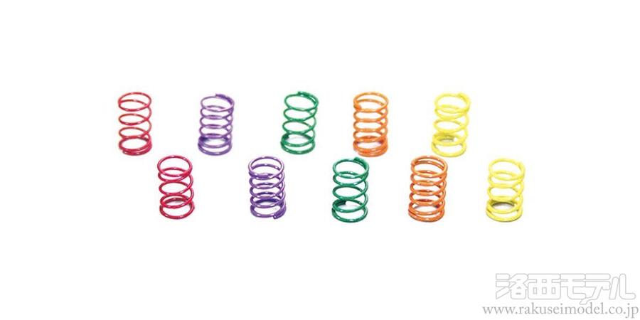 フロントサスペンションの硬さを調整するスプリングセット。硬さの異なる5タイプ入り。