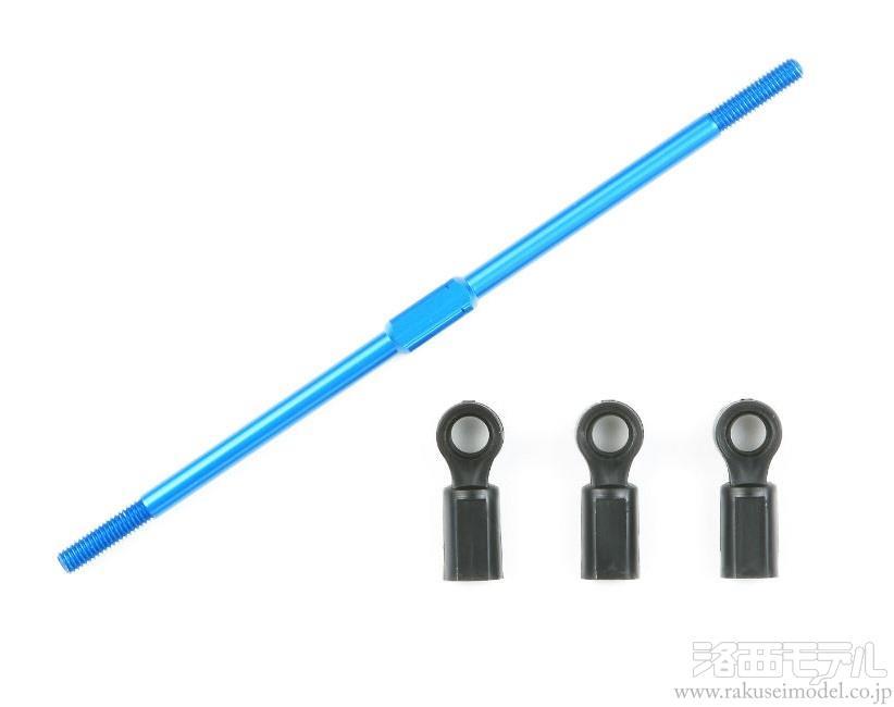 キット標準の3×89mm両ネジシャフトに換えて使用。ステアリングロッドを外すことなく、中央の四角部分を回すだけで微妙な長さ調整が可能です。ブルーアルマイトカラーで仕上げた軽量なアルミ製。
