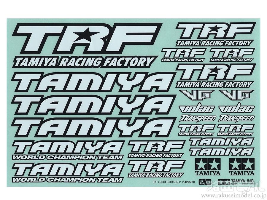 TRFやタミヤをはじめ、VG、VOLAC、TRANSPEEDなどのロゴを用意。黒枠つきのホワイト文字はどんなカラーリングのマシンにもフィットします。