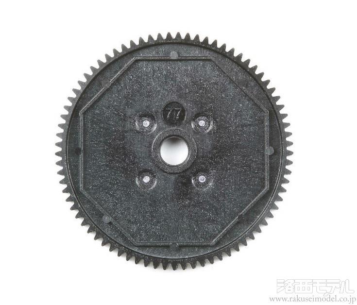 キット標準の79Tに比べてハイギヤードタイプの77Tスパーギヤです。新開発の歯形状と樹脂材料の選択により、静粛性と駆動効率を向上。79Tと組み合わせて、細かなギヤ比の設定が可能です。