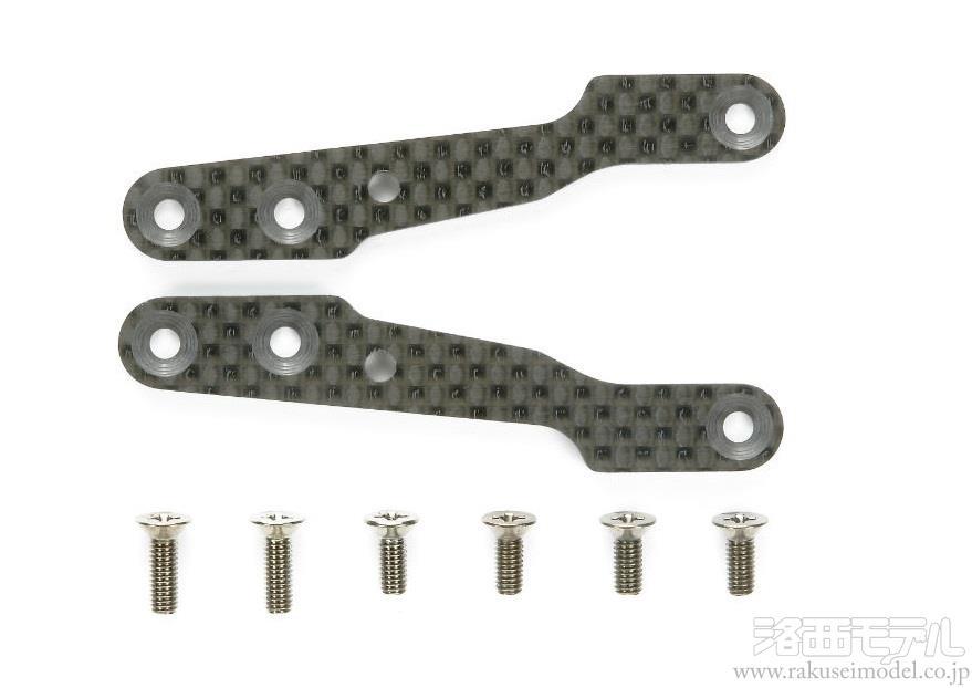標準装備のK9、K10部品に換えて使用。たわみやしなりの少ない3mm厚のカーボン製ステフナーがリヤまわりのシャーシ剛性を高め、ダンパーの作動効果を最大限に引き出して、より繊細なセッティングが可能になります。組み立てに必要な3×10mm皿ビス、3×8mm皿ビスもセット。