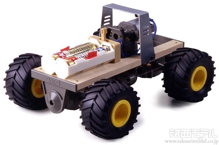 【 デコボコの激しい道も坂道も元気いっぱいに走ります 】 1つのモーターで4つのタイヤを動かして走る4輪駆動車の組み立て工作キットです。モーターを取り付けたセンターギヤボックスからシャフトで前後に駆動を伝達する、実車と基本的に同じシャフトドライブ方式の4輪駆動システムを採用。センターギヤボックスと前後のギヤボックスは組み立て式。前後ともステンレス製金属線を使ったサスペンション機能を持ち車体のバランスを保ちます。タイヤは直径50mmのラグパターンタイプで弾力のある中空ゴム製。電池ボックスは逆転スイッチ付きで、バックもOKです。