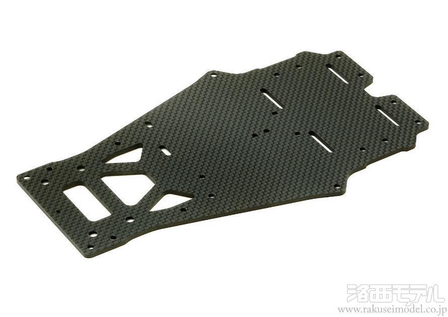 標準装備のFRP製に換えて使用する2.5mm厚カーボン製ロワデッキ。シャーシ全体の剛性を上げ、走行性能を最大限に引き出します。また、サーボの位置を2mmフロント寄りに搭載可能。取付穴を楕円形にしてサーボの左右方向の微調整ができ、取り付け穴を追加してミニサーボにも対応。LFバッテリーをグラステープで固定するためのスリットも追加しました。