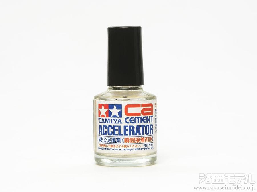 ★接着対象の片面に硬化促進剤を塗り、もう一方に瞬間接着剤を塗って貼り付ければすぐに硬化。細かなエッチングパーツなど、接着面の少ない部品に効果的。