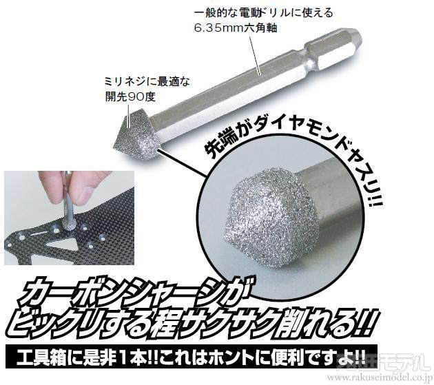 通常の面取りドリルをカーボンシャーシに使用した場合、すぐに歯がダメになってしまい削れなくなってしまいますが、