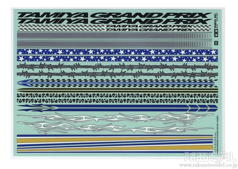 実車のアメリカンカスタムカーをイメージさせるような、帯状のマーキングを中心にまとめたステッカーセットです。ボンネットからルーフに伸ばしたり、ボディサイドに配置するのが効果的。TAMIYA GRAND PRIXのロゴをはじめ、鉄条網やドクロ、フレーム(炎)など10パターンの帯状マークを用意しました。