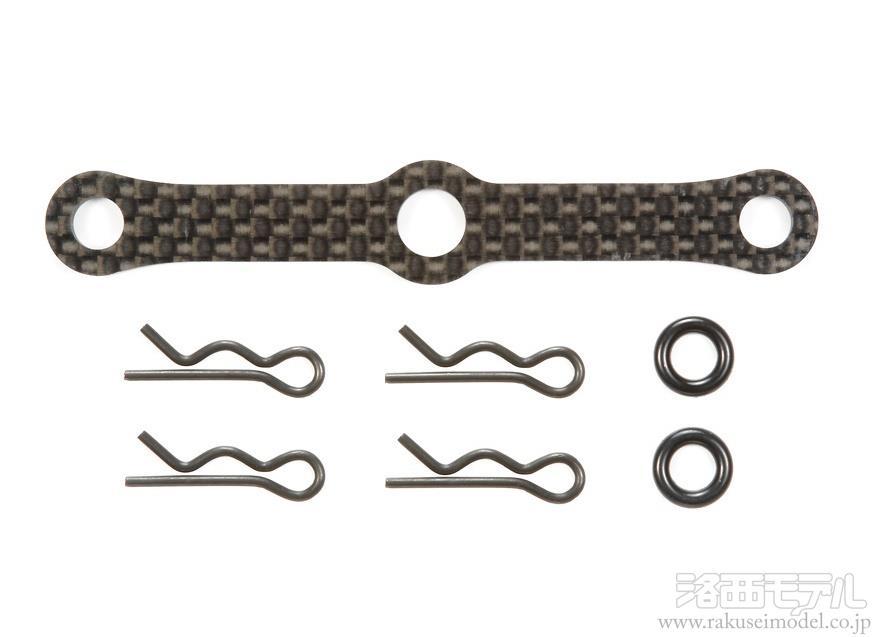 長いボディマウント使用するボディが多いMシャーシ。そのボディマウントの剛性を上げる2.5mm厚のカーボン製メンバー。走行中のボディのブレを軽減します。