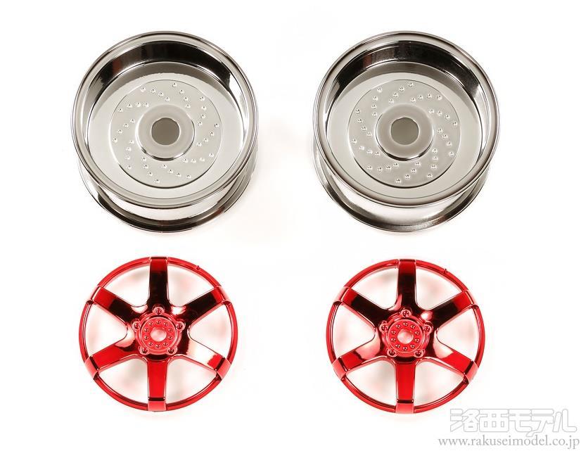 1/10ツーリングカーに幅広く使える2ピースホイールです。スポーク部分は鮮やかなレッドメッキ、リム部分はクロームメッキ仕様。足まわりのドレスアップ効果も抜群です。
