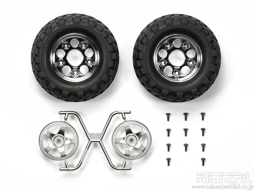 リム部分をクロームメッキ、スポーク部分をツヤ消しメッキで仕上げた5本スポークホイールに、ブロックタイヤをセット。CC-01シャーシのドレスアップパーツとしてはもちろん、力強いブロックパターンタイヤは、クロスカントリー走行時の走破性をアップします。