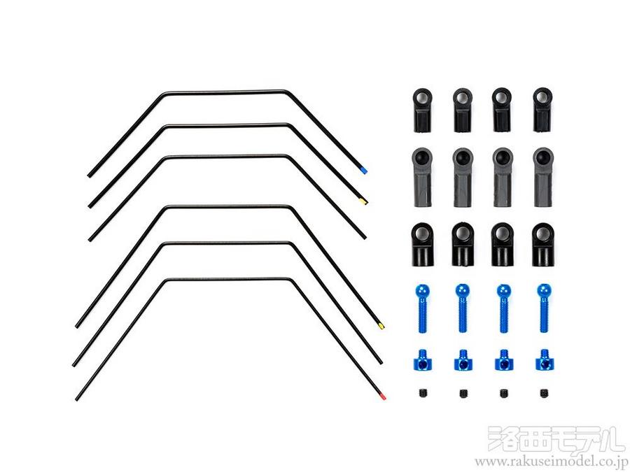車体のロールをおさえて、高速コーナリング時の安定性をさらに高めるスタビライザーは、サスペンションセッティングに欠かせないパーツ。前後それぞれ3種の硬さをセットしました。表面カラーはブラック。フロント:φ1.5(識別マークはブルー)、φ1.4(識別マークはイエロー)、φ1.3(識別マークはなし)、リヤ:φ1.3(識別マークはイエロー)、φ1.2(識別マークなし)、φ1.1(識別マークはレッド)。