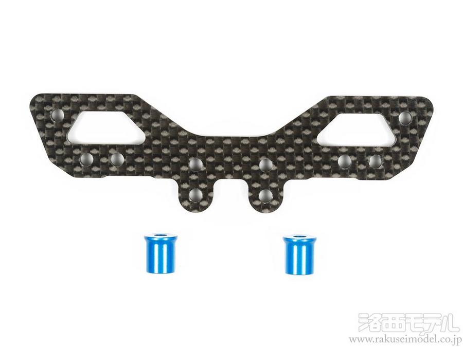 CVAダンパーミニIIが装着できる、高剛性な3.5mm厚カーボン製ダンパーステー。キット標準のダンパーに比べてロングダンパー仕様になるため走行性能を高めます。