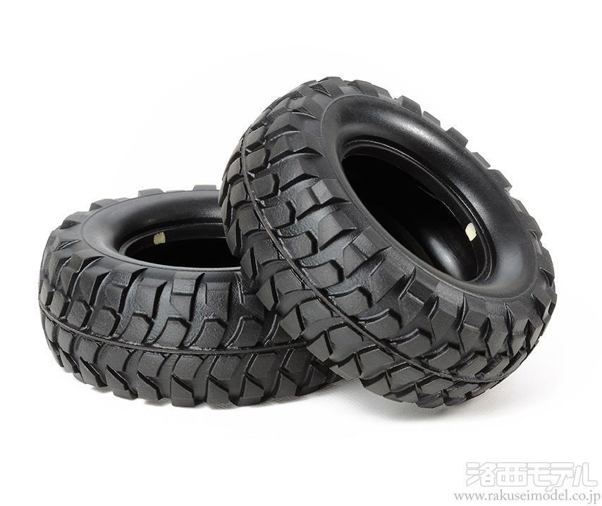 ソフトコンパウンドの採用したCC-01シャーシ用のタイヤです。トラクションを高めて悪路走破性を向上。また、キット標準のノーマルタイヤ(直径88mm)に比べて大径の94mm。ギャップなどの乗り越え性能が高まって、クロスカントリー走行に最適です。