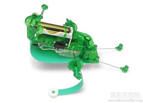 たわむ材質を使用したプレート状の足(フィンレッグ)を同時に回転させることで、ジャンプするように進むユーモラスな動きの工作セットです。