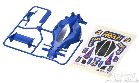 ミニ四駆の人気車種「アバンテJr.」のキャノピー部分をスモークカラー、ボディ部分をブルーに2色成形したスペシャルボディパーツです。