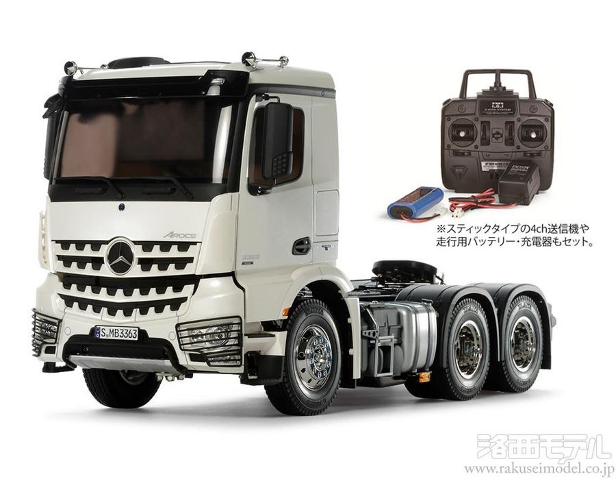 高級乗用車メーカーとしてはもちろん、世界最大のトラックメーカーとしても知られるドイツのダイムラー社。2013年から導入された同社のヘビーデューティートラックシリーズ「アロクス」の中で、630馬力を誇る排気量15.6リッターの直6ターボエンジンを搭載した後2軸駆動のトレーラーヘッド、アロクス3363 6×4の電動RCカー組み立てキットです。精密金型を使用してロールーフ・ナローキャブ仕様のクラシックスペースをモデル化。「バケットティース」と呼ばれる個性的なデザインのフロントグリルは別パーツ。スキッドプレートを装備した高い位置にあるバンパーやヘッドライトガードなど、迫力あるスタイルを実感たっぷりに再現したスケール感ある仕上がりです。また、金属パーツを多用した車体構成は作りごたえも十分。組立式の3速トランスミッションを搭載して、4チャンネルプロポを使用すれば、RC操作で走行中のギヤチェンジが楽しめます。