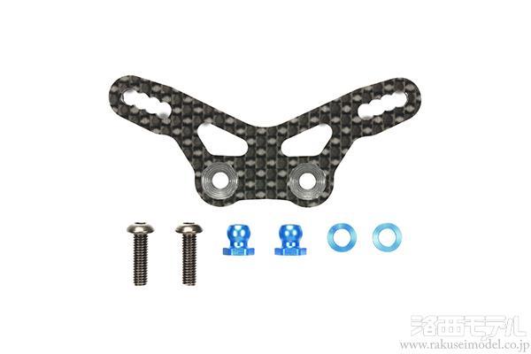 キット標準のB12部品に換えて使用する、軽量・強固でたわみの少ない3mm厚のカーボン製ダンパーステー。ダンパーの取り付けピッチを細かく設定し(4ヶ所)繊細なセッティングが可能です。ダンパー取り付け用の3×10mm六角丸ビスやセッティングスペーサー、ピロボールナットもセットしました。