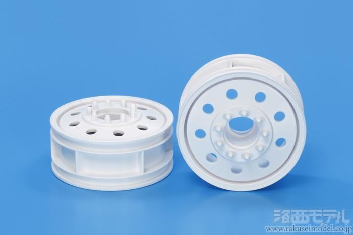 1/14RCトレーラーヘッドに標準装着されているツヤありメッキホイールに換えて使用します。実車ではメーカー純正のスチールホイールや、ポリッシュされていないツヤ消しアルミホイールの装着が一般的だけに、ホワイトカラーのホイールに交換することで、「運送仕様」や「素」のトラックにイメージチェンジでき、リアル感を高めます。また、好みの色で塗装しやすいホワイトカラーもポイントです。