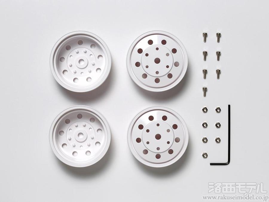 1/14RCトレーラーヘッドに標準装着されているツヤありメッキホイールに換えて使用します。実車ではメーカー純正のスチールホイールや、ポリッシュされていないツヤ消しアルミホイールの装着が一般的だけに、ホワイトカラーのホイールに交換することで、「運送仕様」や「素」のトラックにイメージチェンジでき、リアル感を高めます。また、好みの色で塗装しやすいホワイトカラーもポイントです。
