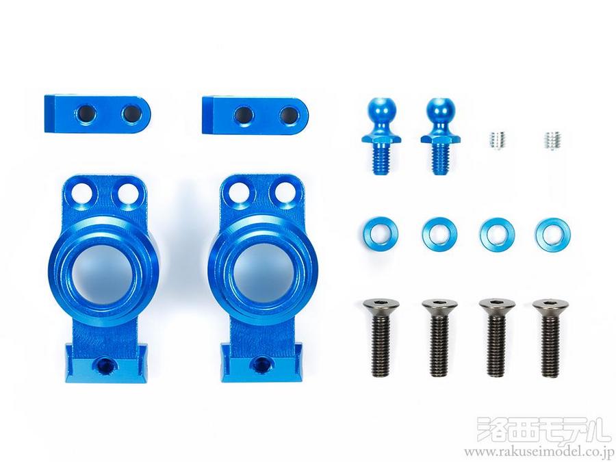 2ピース構造のアルミ切削製リヤアップライト。リヤサスペンションの組み付け剛性を高めるだけでなく、アッパーアームの長さと取付角度を変更でき、コースにあわせたハンドリング特性のセッティングが可能です。