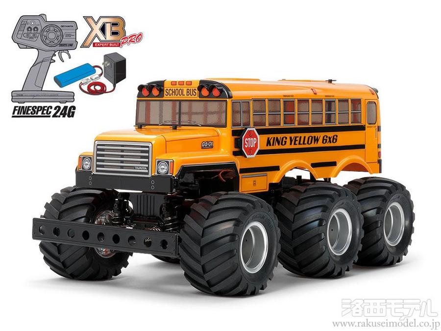 アメリカで一般的なボンネットタイプのスクールバスボディと、大径タイヤを6個装着したシャーシの組み合わせがユニークな完成電動ラジオコントロールカーです。ムードたっぷりのボディはタミヤニュースなどでもおなじみのイラストレーター有野篤氏が監修。片側に8つの窓を持つロングタイプのポリカーボネート製ボディはキャメルイエローで塗装済みです。さらに、ステッカーで表現されたラジエターグリルやヘッドランプ、テールランプ、ロゴなども貼り込み済み。スクールバスには欠かせない前後のルーフライトや左側面の停止標識がアメリカンな雰囲気を高めます。ホイールはつや消しシルバーメッキ仕上げ。直径113mmのラグパターンタイヤを装着して走る場所を選びません。