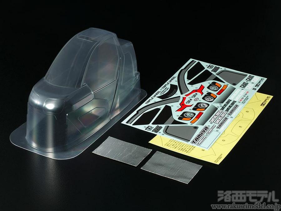 キット標準装備の1.0mm厚ポリカーボネート製に比べて薄い0.8mm厚のボディです。軽量化や低重心化に効果的。さらに切り返し性能も高めます。補強などに使えるアルミグラステープやマーキング用ステッカー、スナップピンもセットしました。