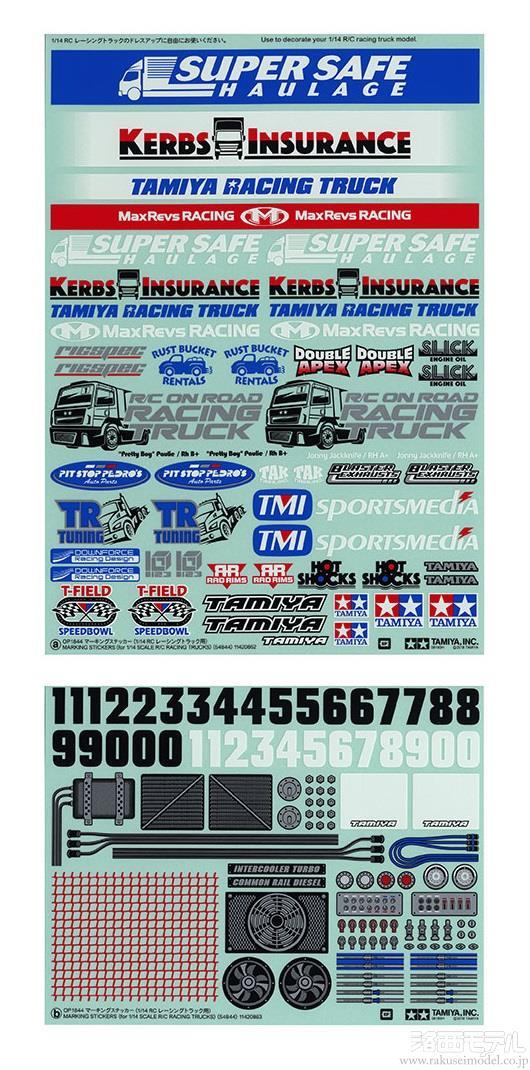 迫力たっぷりのボディに、多くのスポンサーロゴが貼られたオンロードレーシングトラック。そんな実車のイメージを再現するのに欠かせないオリジナルデザインのロゴを集めました。さらにゼッケンやラジエター、配線などのステッカーも用意して、ボディの仕上がりを高めます。