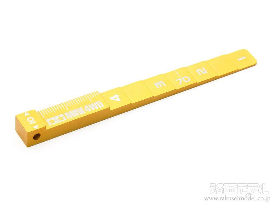 レースに参加するために必要な、マシンの様々な部分の寸法が確認できるアルミ削り出し製のゲージです。