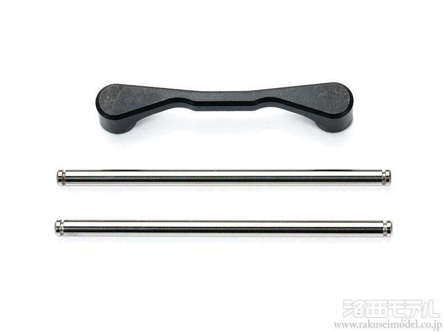 標準装備のU字シャフトに換えて使います。スチール製サポートブリッジと2本のステンレスサスシャフトで構成。サスアームのガタを減らして滑らかな作動を生み出します。また、左右別々にサスアームを組み立てられるので、メンテナンス性もアップします。