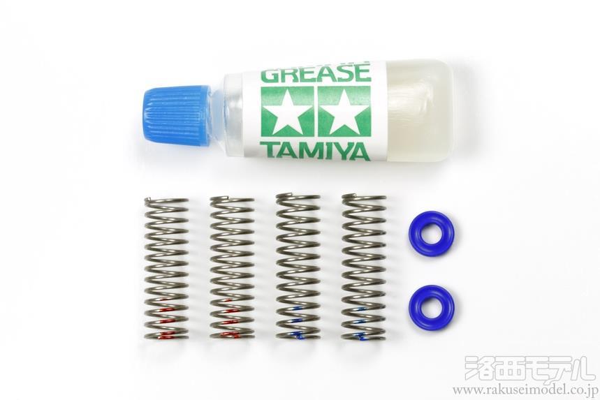 標準装備のMC9スプリングに換えて使用します。ソフト(赤)、ハード(青)のスプリングを用意して、操縦特性のセッティングが楽しめます。付属のグリスを付けてダンパー効果を生み出す3mmXリングもセットしました。