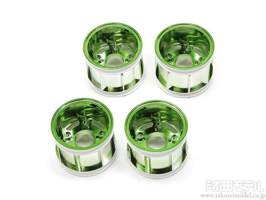 コミカルムードたっぷりのWR-02CBシャーシをいっそう個性的に仕上げるグリーンメッキ処理されたホイールリムです。2分割構造を採用してカラーコーディネートが楽しいWR-02CBシャーシのホイール。輝きのあるグリーンメッキのホイールリムがマシンのカスタムムードをいっそう高めます。様々なカラーのWR-02CB Sパーツ(スポーク)と組み合わせて使います。