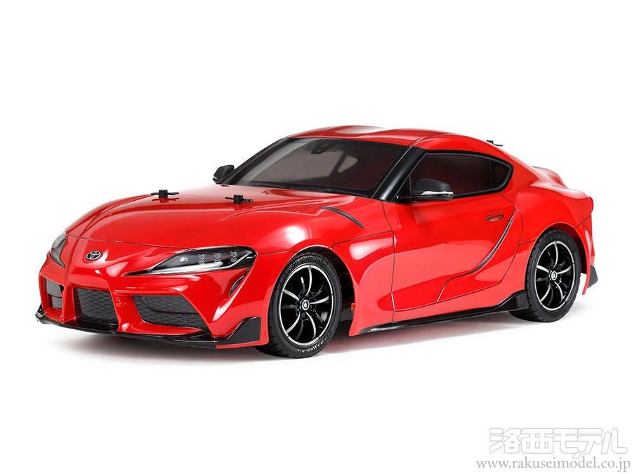 2019年1月にワールドデビューしたトヨタの2シータースポーツカー、GRスープラを再現した電動ラジオコントロールカーの組み立てキットです。ポリカーボネート製ボディは、ダブルバブルルーフや盛り上がった前後のフェンダー、リヤゲートのダックテールなど、特徴的な形状をリアルに再現。フロントグリル、リヤバンパーと2本出しのマフラー周辺、サイドステップなど、凹凸面は極力エッジを生かしています。また、前後のライトケースをポリカーボネートの別部品で用意し、塗装とステッカーにより精悍な表情を演出。ワイパーやエンブレムの違いにより、日本仕様、アメリカ仕様、ヨーロッパ仕様を選んで仕上げられます。加えて、別パーツ構成のドアミラーには側面にある小さな3本の突起も再現。シャーシは組み立てやすく、操縦もしやすいシャフトドライブ4WDのTT-02を採用しました。