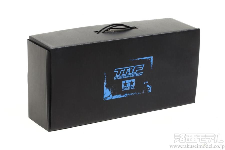 1/10RCツーリングカー1台がぴったり入る、3mm厚のプラスチックダンボール製キャリングケースです。雨や湿気に強く、オイルなどがこぼれても拭き取れる丈夫さがポイント。カラーはシックなブラック。天面にブルーでタミヤとTRFのロゴを印刷しました。樹脂製キャリングハンドル付。