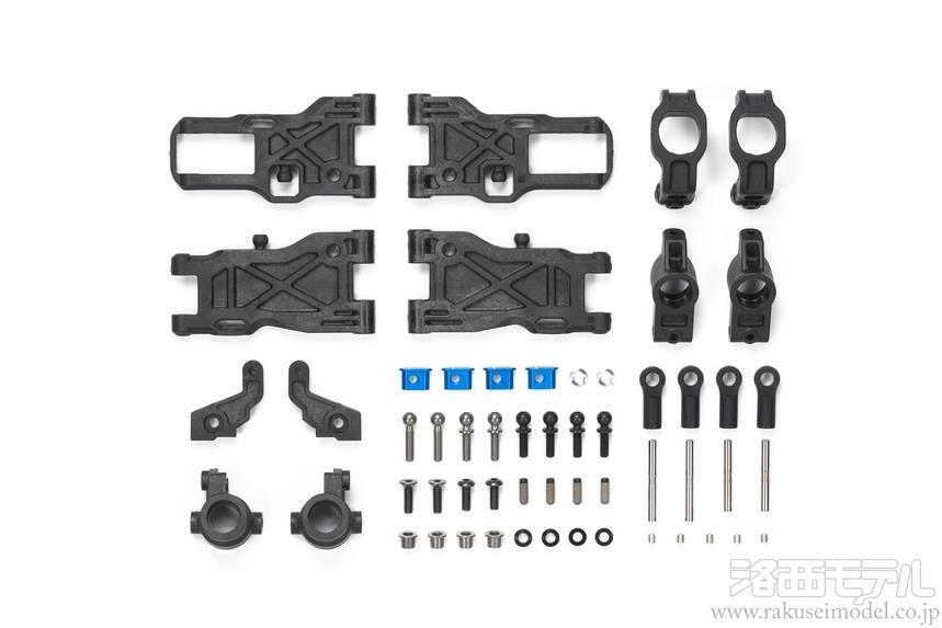 フロントアップライト、フロントハブキャリア(4度)、前後サスアーム、リヤアップライトをセット。