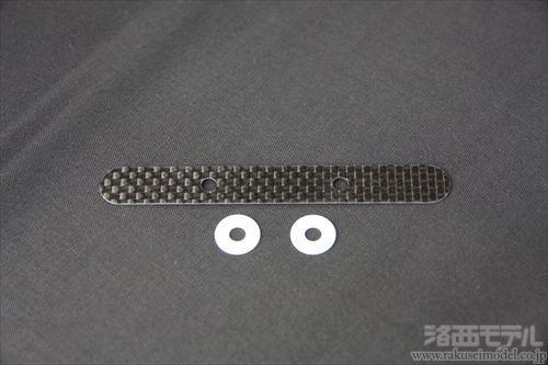 ステアリングラックセットの穴形状に合わせた薄型カーボンプレートと専用デルリンワッシャーセットとなっています。