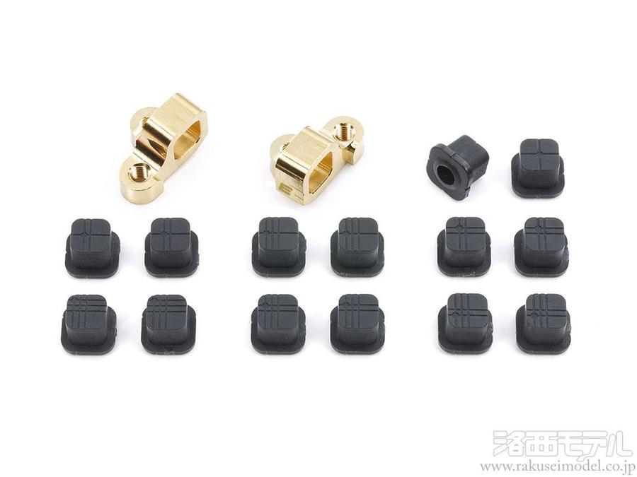 アルミに比べて重いブラス(真ちゅう)製のため、ウエイトとしても機能するサスマウント。付属の樹脂製ブッシュにより、トー角、車幅、ロールセンター、スキッド角の変更も手軽です。
