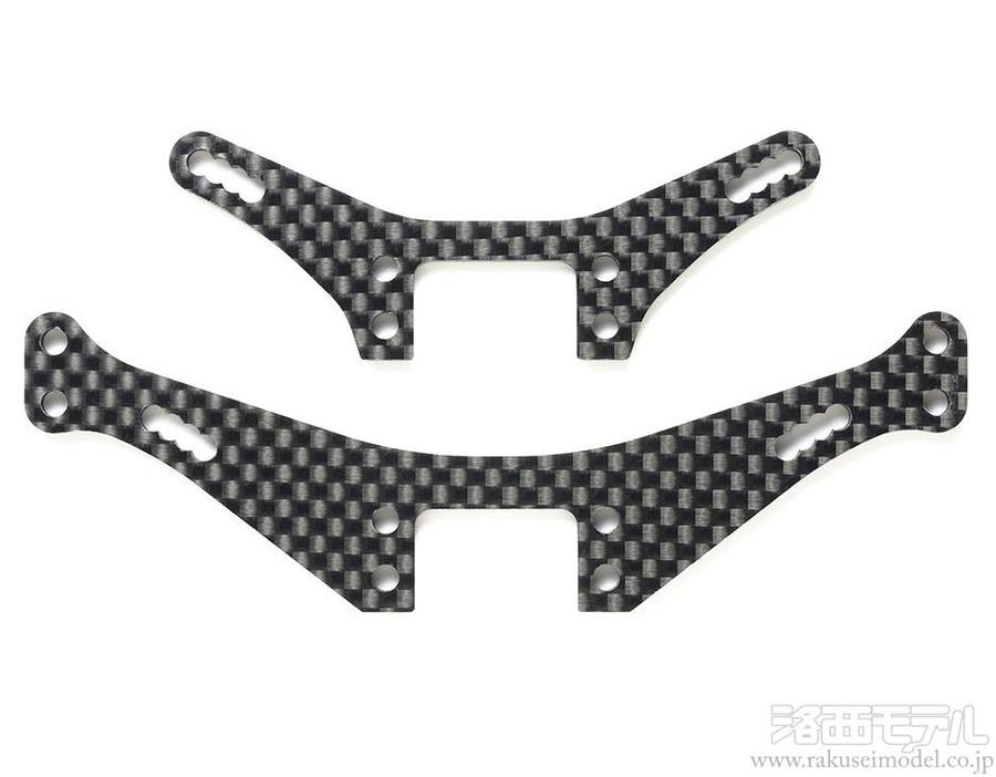 TRF-SSBBダンパーが標準装備されているTRF420に、TRFダンパーを取り付けるためのステーです。特設サーキットやパーキングロットなどでは、ITEM42102 TRFスペシャルダンパーといったストロークのあるダンパーが必要です。それらのダンパーを装着するためのカーボン製ステー。セッティングの幅を広げます。