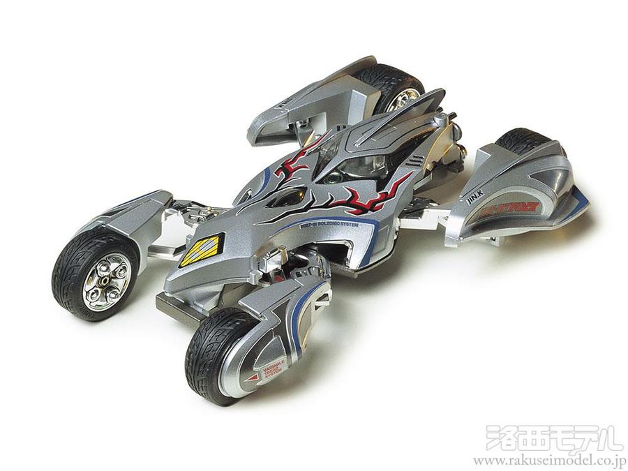 ミニ四駆マンガ『爆走兄弟レッツ&ゴー!!』に登場するマシンのメカニズムが楽しめる「リアルミニ四駆シリーズ」のプラスチックモデル組み立てキットです。車幅を狭めて障害物の間もすり抜けるように走る可変トレッド機構をモデルでも再現。左右のタイヤをいっぱいに広げたワイドモード、車体の前後でタイヤをあわせ、車幅を狭くしたバトルモードなど、マンガでの活躍そのままに姿が変えられます。内部メカは金属を思わせるメッキ仕上げ。ボディは透明パーツ。ボディと内部メカはスーパーX、1、TZの各シャーシに搭載することも可能。組み立ては接着剤を使わないはめ込み式です。