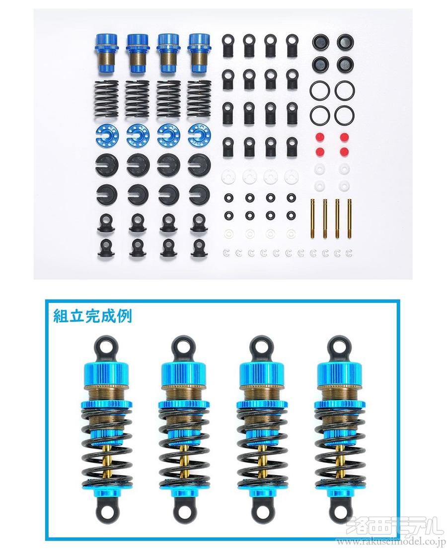 シリンダー、スプリング、ダンパーシャフト、ピストンなど各4本ずつセット。アルミパーツはブルーアルマイト加工。