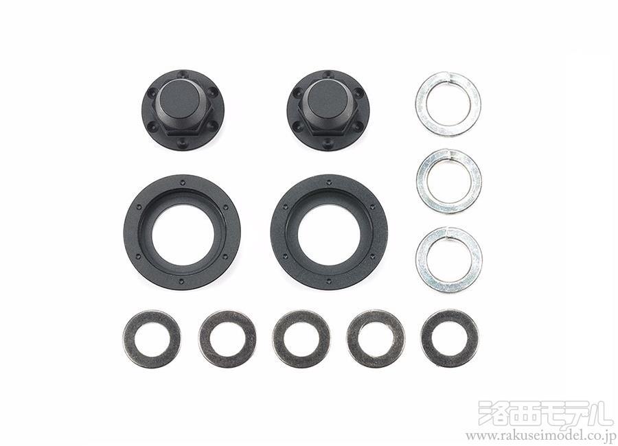 キット標準の4mmフランジナットに換えて使用。ハブカラーをハブナットにゴム系接着剤で固定し、キットの十字レンチで締め込みます。実車をイメージしたアルミ製のハブナットが仕上がりのリアリティをさらに高めます。ハブナットとハブカラーはマットブラック仕上げ。1/14RCビッグトラックシリーズのトレーラーヘッド各車をはじめ、パネルバンやダンプトラック、ティンバートラックの前輪。シングルタイヤのセミトレーラーに使用可能です。